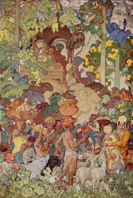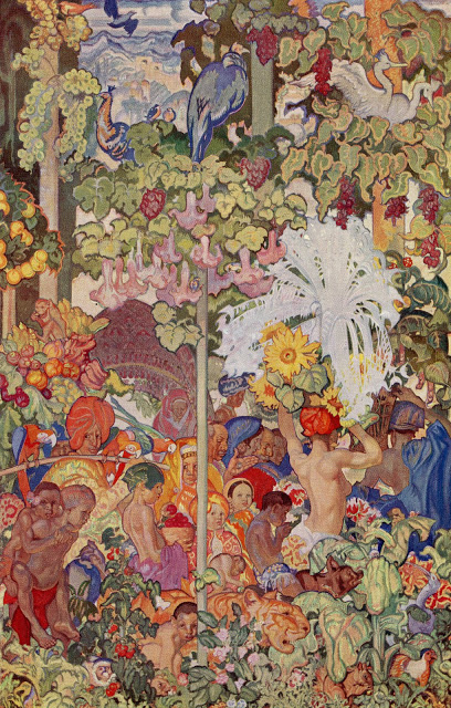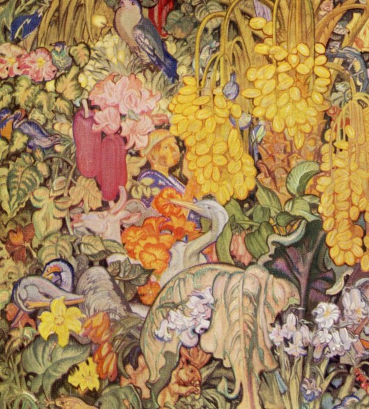 Ruth Thomas continued: “He strikes the note of actual warfare only, in relation to all living. The riot of life, struggle for power, parasitism and greed, sex, mother love, and pleasure are all portrayed in a most exotic symbolism and the brightest and most exhilarating of greens, blues and oranges. He contemplated, too, a modern panel, with industrialism and luxury in contrast, but there is only a rough sketch of it. It is now thought they will be bought by America and the Lords wont wake up until 2050”.